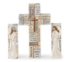 | 聖書などのみ言葉が刻まれた石が積み上げられている、人気デザインのクロスの置物に、エンジェルのブロックも加わりました。 日々の希望と励ましを思い出させてくれます! 十字架を中央に3個並べても、別々に飾っていてだくことも出来るデザインです♪ |