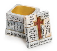 "God is never more than a prayer away", "Believe" 「信頼」、「神は私たちの祈りを聞き届けてくださいます」、「喜び」、「神は常に祈りを捧げれば近づけます」、「信仰」 上記の、聖書などのみ言葉が刻まれた石が積み上げられている、人気デザインのトリンケットボックスです。 日々の希望と励ましを思い出させてくれます! コンパクトながらも味わい深い小箱は、アクセサリーやその他の思い出の品を入れるのに最適です♪ |